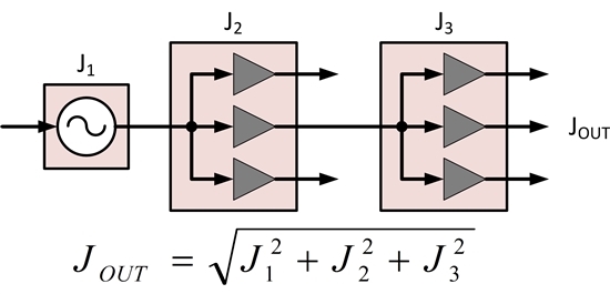 LMK00304 扇出緩沖器就是一個很好的例子。時鐘緩沖器產生的附加抖動主要影響時鐘的寬頻帶噪聲。它可使用圖 2 中所示的方根公式進行計算。